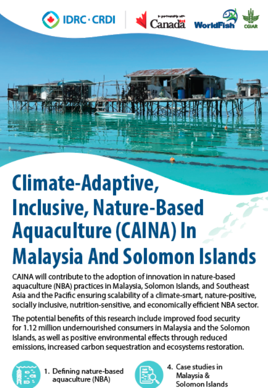 This banner outlines the objectives and scope of CAINA project, funded by IDRC and led by WorldFish in collaboration with partner universities and organizations in Malaysia and the Solomon Islands.