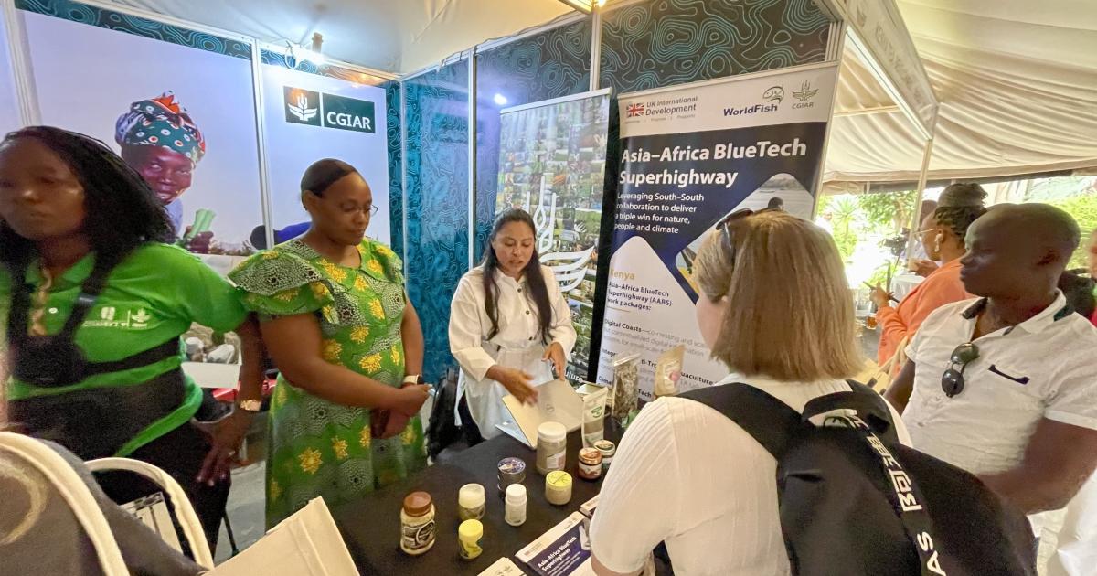 Sara Bonilla, a WorldFish Gender Scientist, began with a quiz that revealed how central aquatic foods already are to global diets and livelihoods, and that aquatic foods are among the most climate-smart and nutritious foods we have. Esther Magondu followed with examples from Kenya’s coast from the Asia–Africa BlueTech Superhighway (AABS), where women and youth are running small enterprises through mariculture and integrated aquaculture. Then fish farmer Maxwell Kenga told the story of how science is supporting the community’s work on the ground.
